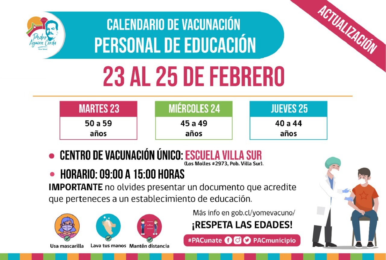 Para el caso del personal de educación el calendario considera la inoculación en el tramo que va desde los 40 a 59 años. Cabe recordar que al momento de presentarse en los puntos de vacunación, los funcionarios deben llevar su acreditación, el que se descarga desde la página http://www.mineduc.cl
