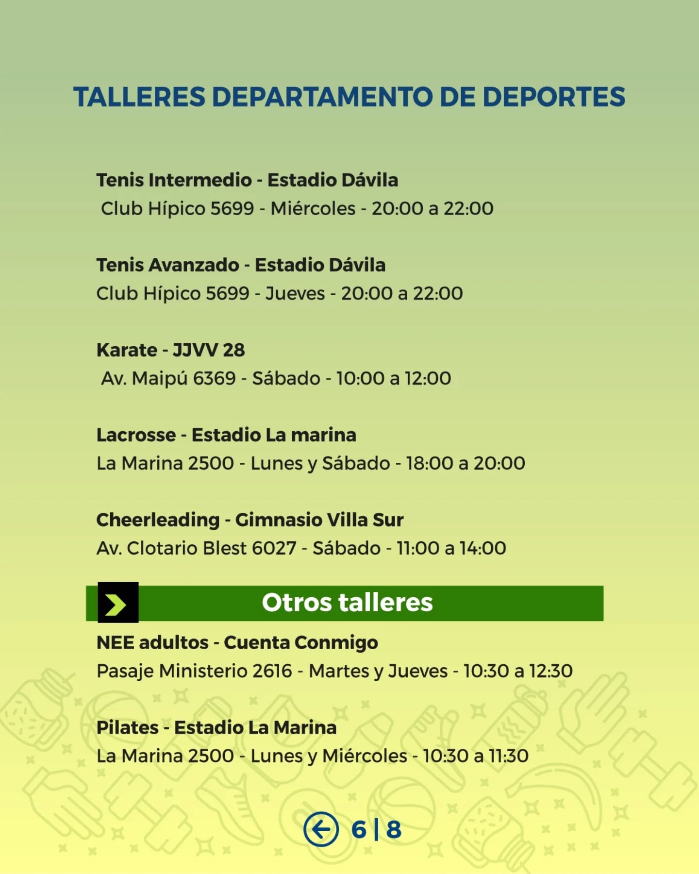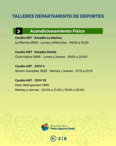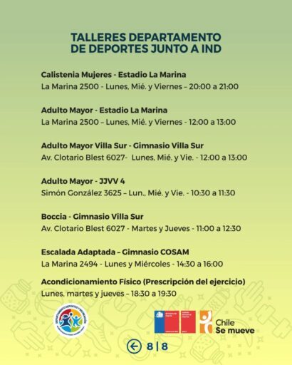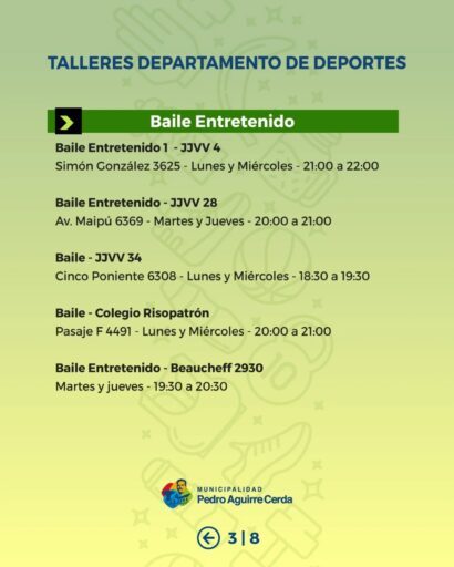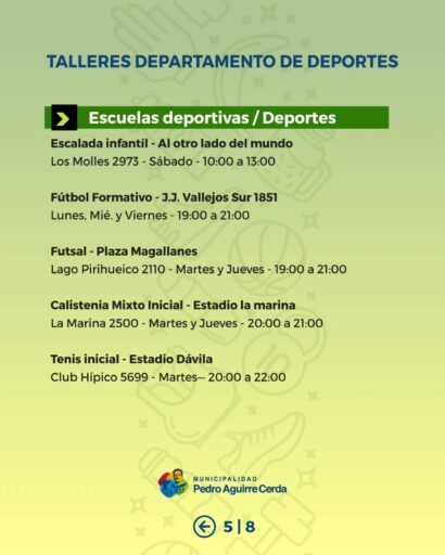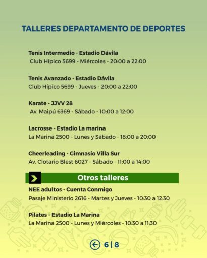 Desde el área de Deportes Municipal invitamos a nuestras vecinas y vecinos a ser parte de los Talleres Deportivos Municipales, espacios gratuitos que se desarrollan en distintos puntos de la comuna y que están pensados para niñas, niños, jóvenes y personas adultas.
