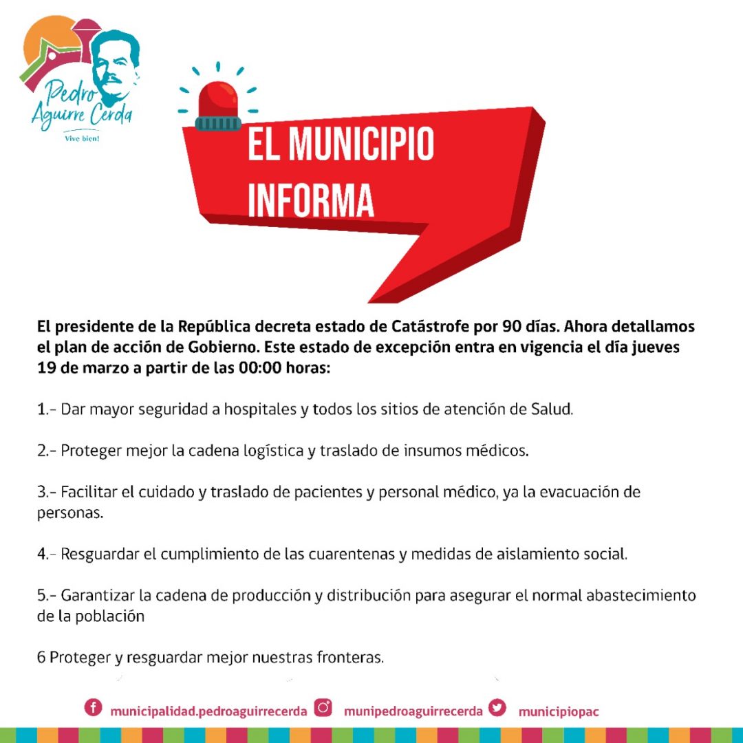 El presidente Sebastián Piñera decreta estado de Catástrofe por 90 días. A continuación detallamos el plan de acción de Gobierno. Este estado de excepción entra en vigencia el día jueves 19 de marzo a partir de las 00:00 horas.