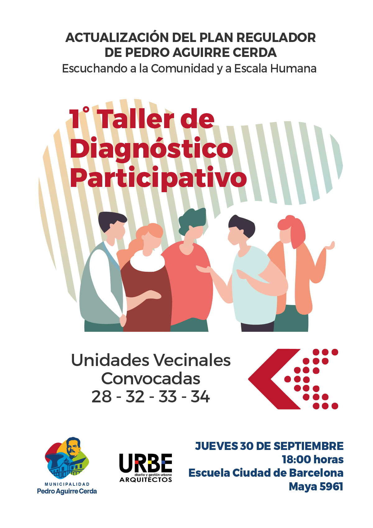 Estamos trabajando en la actualización del Plan Regulador, mediante una propuesta integral que permita brindar una mayor calidad urbana y que a su vez incorpore la participación ciudadana, recogiendo la voluntad de las comunidades y los barrios. Por ello, l@s invitamos a los talleres de diagnóstico que se realizarán en los territorios. Esperamos a tod@s a quienes vivan en las unidades vecinales 28, 32, 33, 34, este jueves 30 de septiembre a las 18:00 horas en la Escuela Ciudad de Barcelona (Maya 5961)