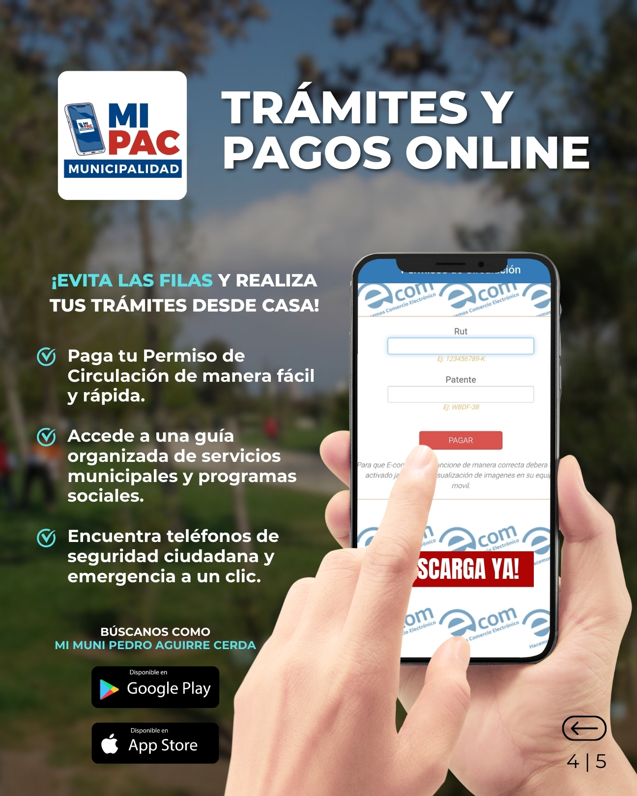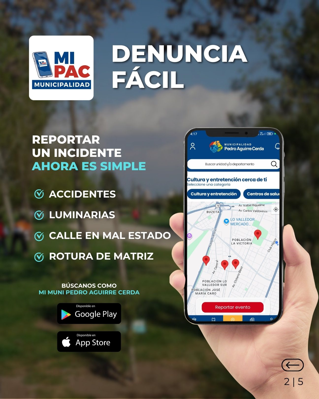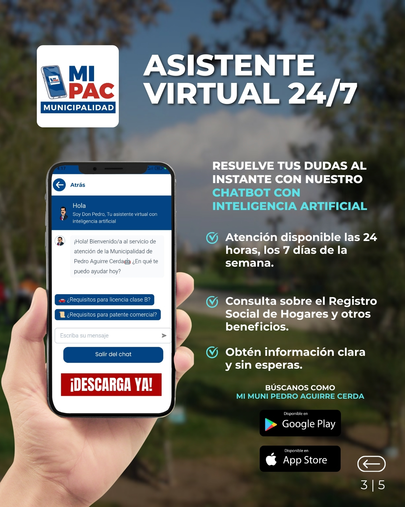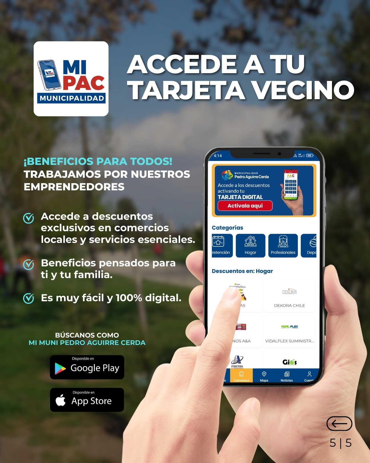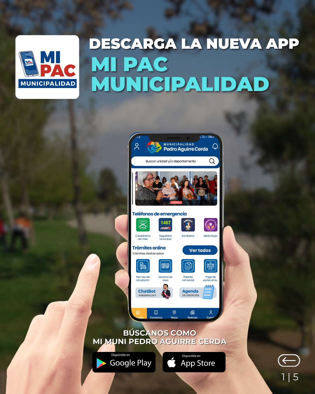 Con la APP Mi Muni Pedro Aguirre Cerda puedes realizar trámites y pagos online, acceder a tu Tarjeta Vecina, hacer denuncias de forma simple y resolver tus dudas con un asistente virtual disponible 24/7.