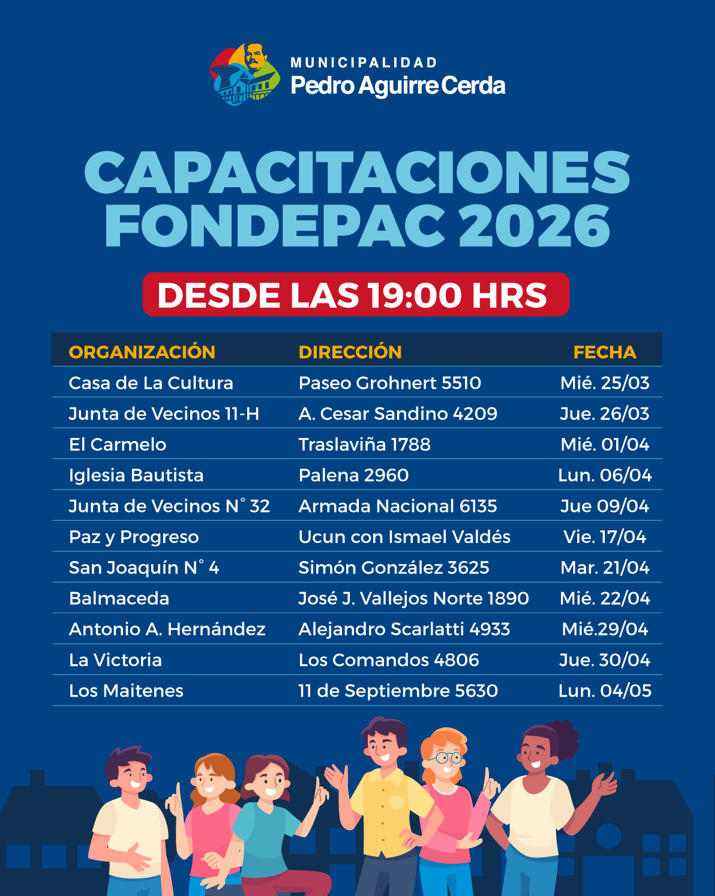 Las capacitaciones se realizarán en distintos puntos de la comuna, desde las 19:00 horas, para facilitar la participación de todas y todos.